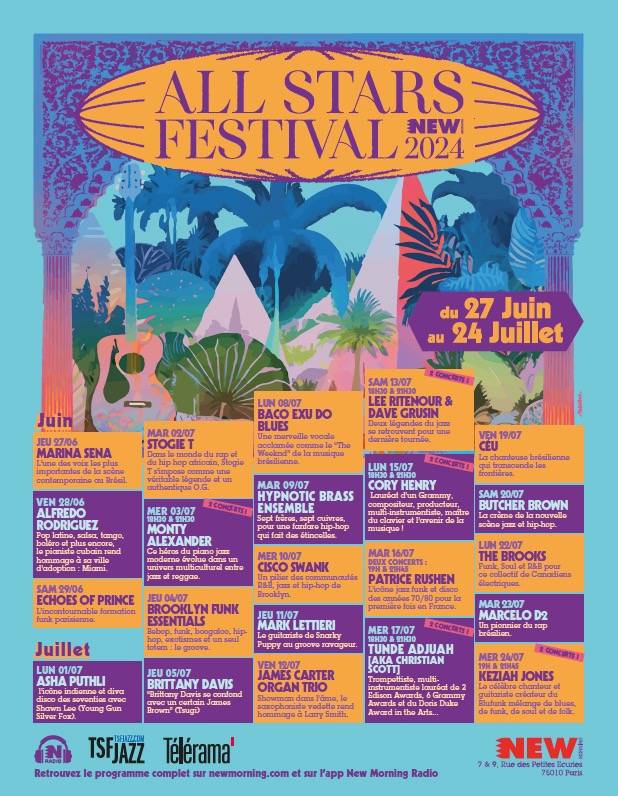 Le festival All Stars du New Morning s’est imposé depuis sa création il y a une quinzaine d’années comme une véritable institution. Aux antipodes du gigantisme et des conditions météorologico-acoustiques incertaines de bon nombre de festivals d’été, le festival All Stars rassemble chaque année des artistes de haute volée dans l’un des clubs les plus mythiques de Paris. Au programme de cette édition 2024, de superbes affiches latines avec Marina Sena, Alfredo Rodriguez, Baco Exu Do Blues, Céu et Marcelo D2 !