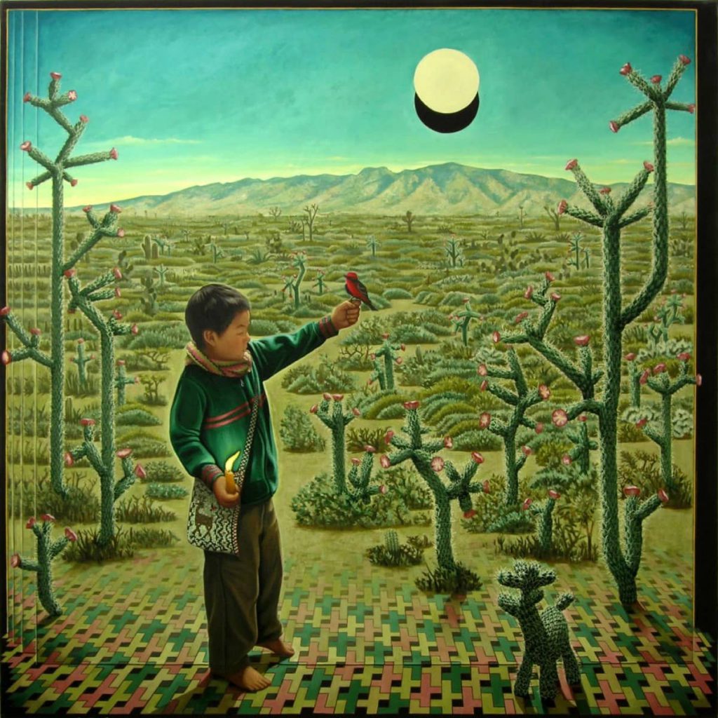 Un univers hybride, à mi-chemin entre l’Europe et le Mexique, peuplé de personnages atemporels et de références aux cultures mexicaine et amérindienne qui lui sont si chères : cactus, enfants, planètes, miroirs, serpents, géométries aux couleurs éblouissantes, perspectives vertigineuses ainsi que le désert, toujours omniprésent.