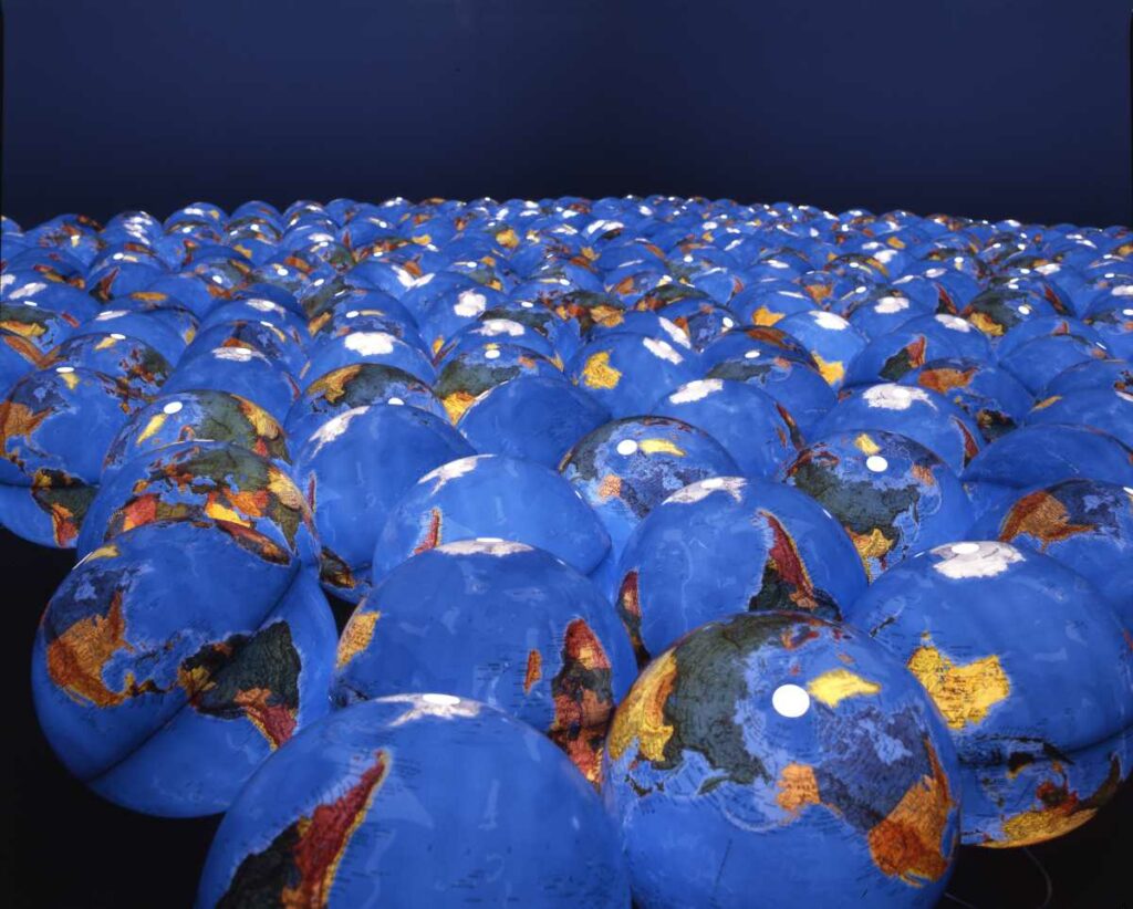 Juste à côté, l’installation d’Ange Leccia, composée d’une multitude de globes illuminés à nos pieds, nous rappelle la fragilité de notre planète. L’artiste palestinienne Émily Jacir évoque quant à elle avec son œuvre Embrace l’impossibilité pour les Palestiniens de regagner leur pays, en mettant en scène un convoyeur à bagages qui tourne à vide.